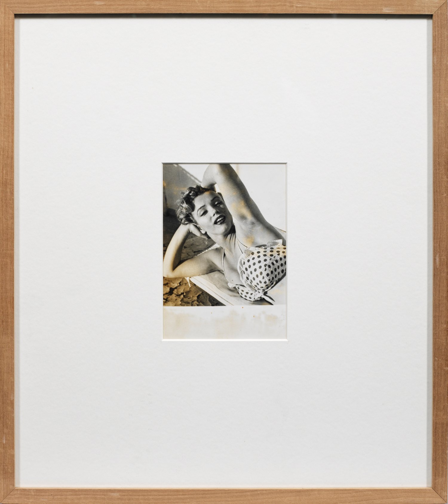 Porträtaufnahme von Marilyn Monroe in dem gepunkteten Bikini aus ihrem Film "Love Nest", anlässlich dessen diese Presseaufnahme vermutlich auf dem Dach des Beverly Carlton Hotels in Los Angeles aufgenommen wurde.