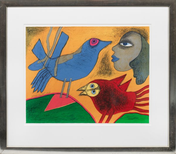 Blattgroße Farbserigraphie/Arches-Velin, 1995. Sign. u. dat., bez. "E/A". Abzug außerhalb der Auflage von 200 Exemplaren. Fantasievolle, expressive, durch starkfarbige Flächigkeit bestimmte Arbeit des Künstlers, der mit Pierre Alechinsky, Karel Appel, Constant, Asger Jorn und K. O. Götz zur legendären, 1948 - 1951 bestehenden Avantgarde-Künstlergruppe "CoBrA" gehörte. Blatt ca. 52 cm x 67 cm. Rahmen.