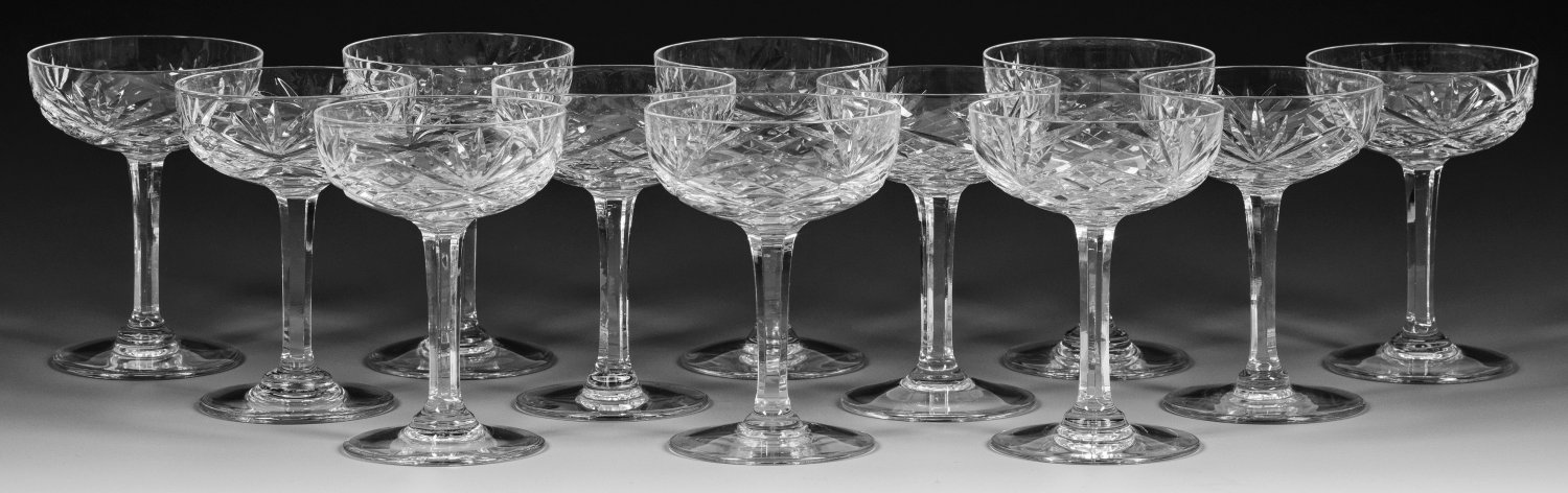 A set of twelve French Saint-Louis "Chantilly" champagne coupe (cup) glasses. Seven glasses with acid factory mark.