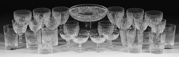 28-tlg.; Farbloses Kristallglas, geschliffen. Bestehend aus Fußschale, 8 Rotweingläsern, 4 Weißweingläsern, 4 Likörschalen, 5 niedrigen Bechergläsern für Wasser oder Whisky und 6 weiteren Gläsern. 1 Glas best., Bechergläser teilw. matt. H. 6,8 cm-13,5 cm.