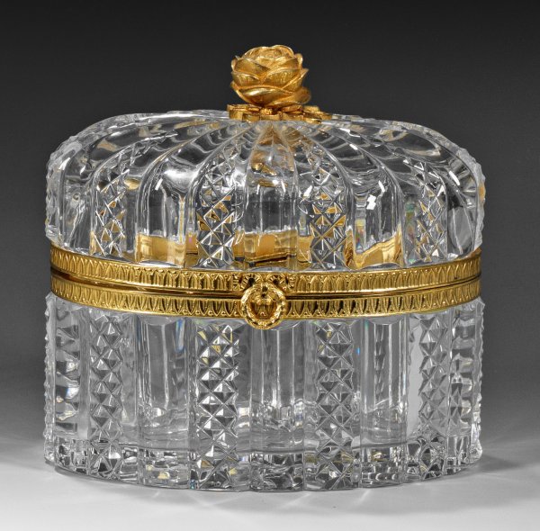 A French cut crystal glass box and cover with gilt hinged brass mounting and gilt bronze rose knob. Label with inscription "CRISTAL TAILLÉ (/) M. Lubliner/PARIS."