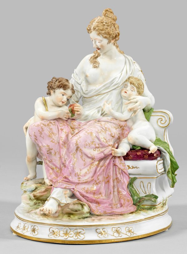Ovaler, profilierter Sockel mit Kleeblattreliefs. Über felsigem Terrain, auf einer volutierten Bank sitzende junge Dame, gekleidet in ein antikisierendes, weißes Gewand mit entblößter, rechter Brust. Auf ihrem Schoß ein rosafarbenes, von Goldranken gemustertes Tuch. Sie umarmt ein sitzendes, schlummerndes Kind zu ihrer Linken bzw. einen Knaben mit Apfel stehend zu ihrer Rechten. Polychrome Malerei mit Goldstaffage. Entw. Emmerich Andresen, um 1900. Modell-Nr. S 168. Unw. rest.; Minim. best.; Schwertermarke. H. 31 cm. 29 cm x 20 cm.