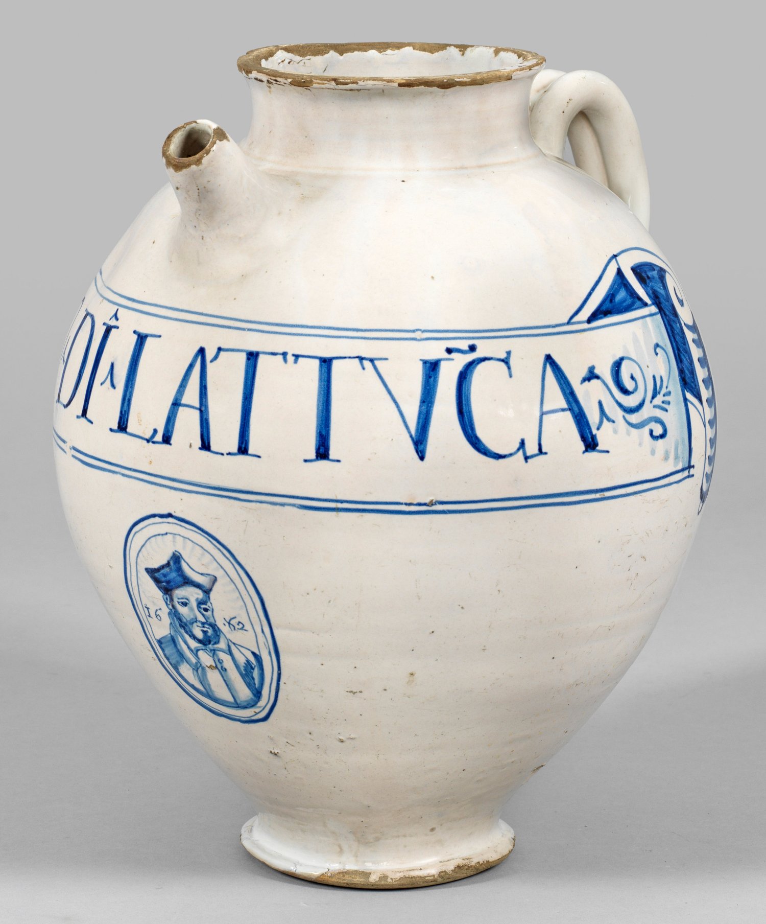 Majolika, sandfarbener Scherben, weiße Zinnglasur. Ovoider Korpus, kurzer, leicht profilierter Hals mit Lippenrand, doppelter Ohrenhenkel mit zweifachem, seitlich schlangenartig auslaufendem Ansatz. Dekor in kobaltblauer Scharffeuermalerei aus einer großen Inschriftkartusche "AQ(UA) DI LATTICA", schauseitig ein Ovalmedaillon mit Porträt eines Jesuiten, dat. 1662. Rest.; H. 33,5 cm.