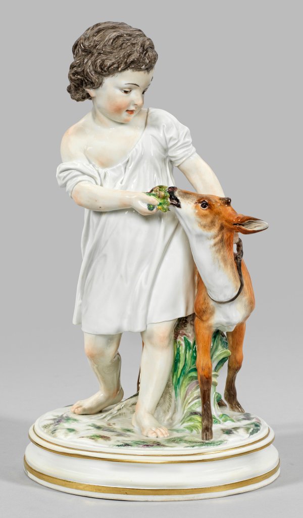 Auf rundem Profilsockel stehender, dunkelhaariger Knabe in weißem, knielangem Hemd, das seitlich stehende Rehkitz am Riemen führend und mit Grünpflanzen fütternd. Polychrome Malerei mit Goldkonturierung. Entw. Johann Christian Hirt, um 1880 - 1882. Modell-Nr. M 148. Unw. rest.; Schwertermarke. H. 37 cm.