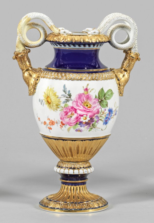 Auf rundem Fuß amphorenförmiger Korpus, umzogen von vergoldeten, reliefierten Ornamentbordüren. Seitlich aus plastischem Akanthusblattansatz aufsteigende Henkel in Gestalt von spiralförmig eingerollten Schlangenpaaren. Teilw. kobaltblauer Fond. Beidseitig der Wandung Blumenarrangements in polychromer Malerei. Goldbronze. Entw. Ernst August Leuteritz. Modell-Nr. E116. Gold minim. ber.; ein Henkel mit Haarriss. Restauriert; Schwertermarke. H. 39 cm.