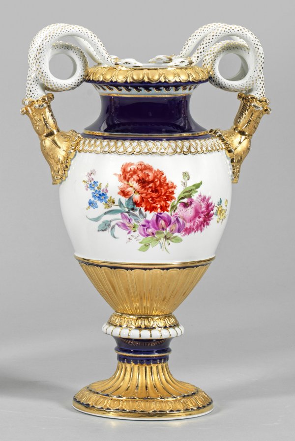 Auf rundem Fuß amphorenförmiger Korpus, umzogen von vergoldeten, reliefierten Ornamentbordüren. Seitlich aus plastischem Akanthusblattansatz aufsteigende Henkel in Gestalt von spiralförmig eingerollten Schlangenpaaren. Teilw. kobaltblauer Fond. Beidseitig der Wandung Blumenarrangements in polychromer Malerei. Goldbronze. Entw. Ernst August Leuteritz. Modell-Nr. E116. Gold ber.; Haarriss an einem Schlangenkopf. Schwertermarke. H. 39 cm.