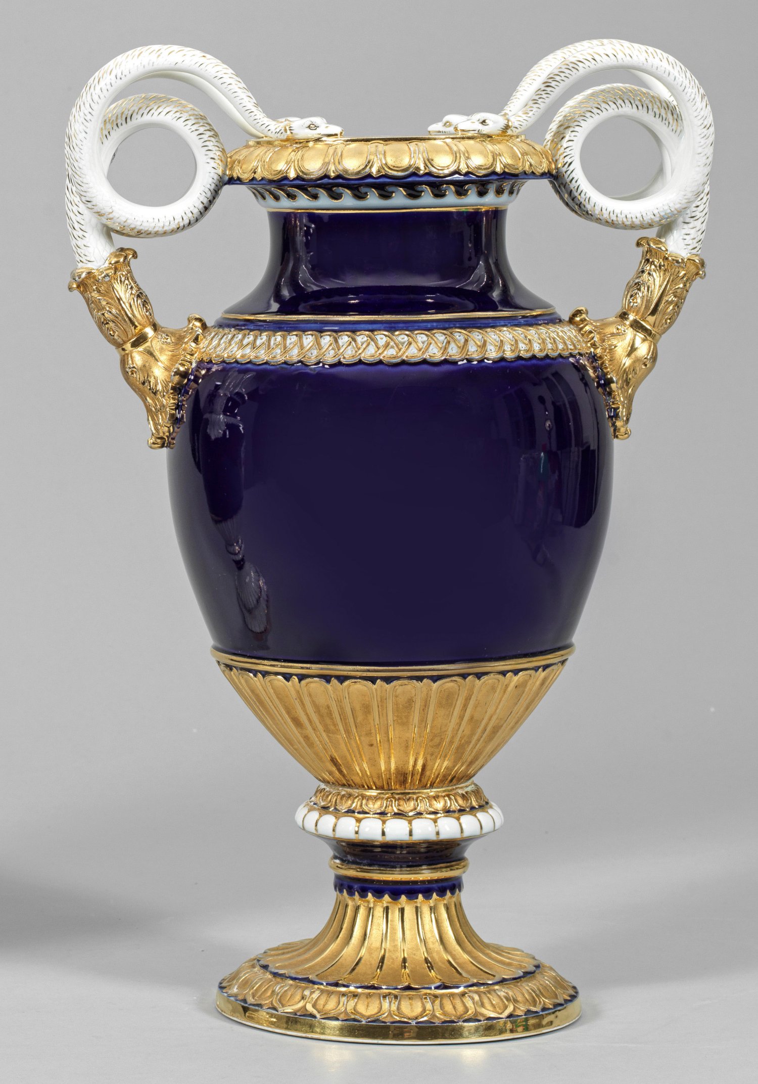 Auf rundem Fuß amphorenförmiger Korpus, umzogen von vergoldeten, reliefierten Ornamentbordüren. Seitlich aus plastischem Akanthusblattansatz aufsteigende Henkel in Gestalt von spiralförmig eingerollten Schlangenpaaren. Kobaltblauer Fond. Goldbronze. Entw. Ernst August Leuteritz. Modell-Nr. A 148. Gold ber.; Schwertermarke. H. 49 cm.