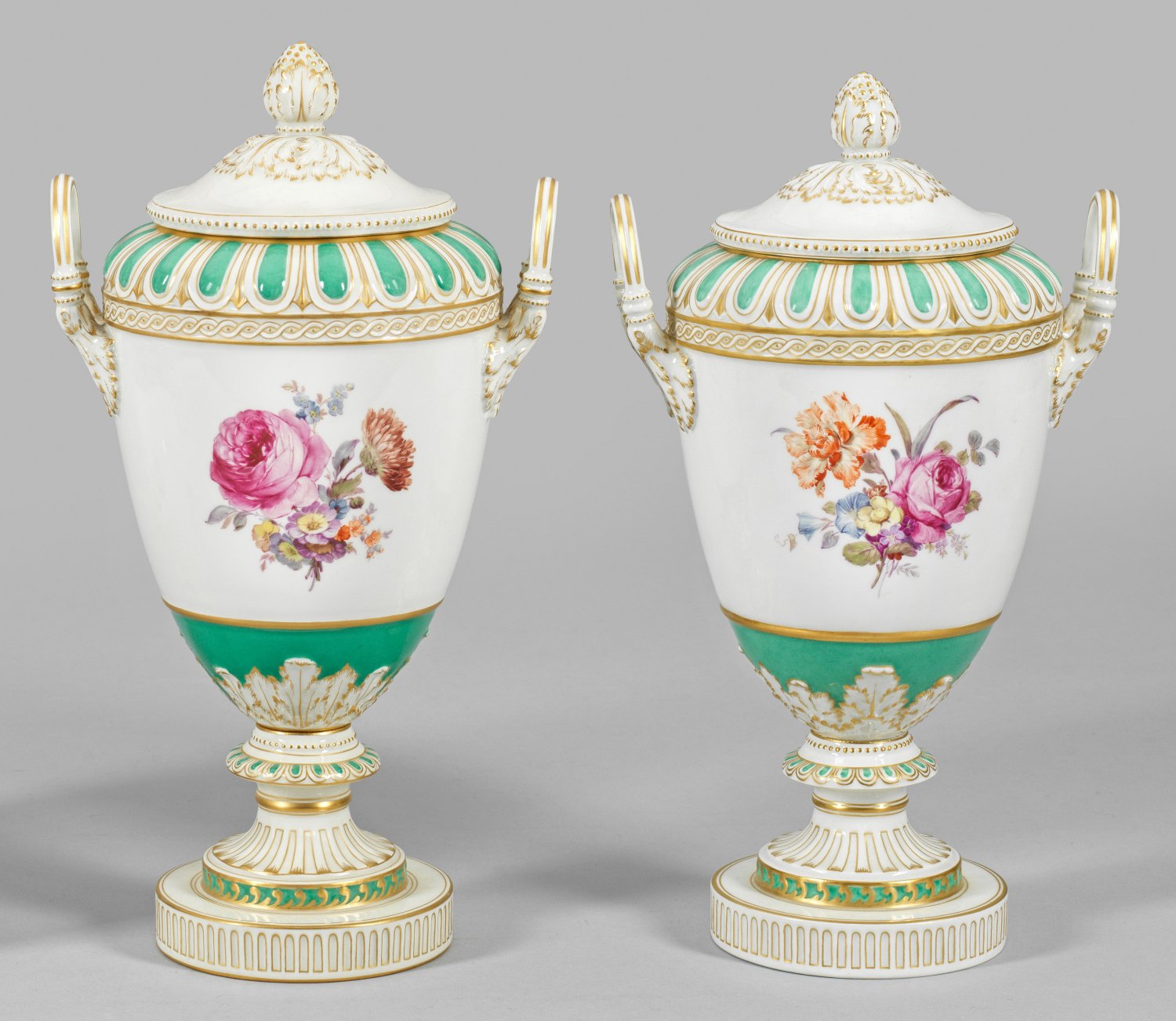 sog. "Weimar-Vase". Über gestuftem Rundfuß ovoider Korpus, umzogen von verschiedenen Reliefornamentfriesen, teilw. auf smaragdgrünem Fond. Seitlich, über Akanthusblattansatz hochgezogene, gebogte Handhaben. Aufgewölbter Deckel mit plastischem Knospenknauf über Blattrosette. Beidseitig der Wandung farbenprächtige Blumenarrangements in feiner, polychromer Malerei. Reiche Goldstaffage. Zepter- und Malereimarke. H. 36 cm.