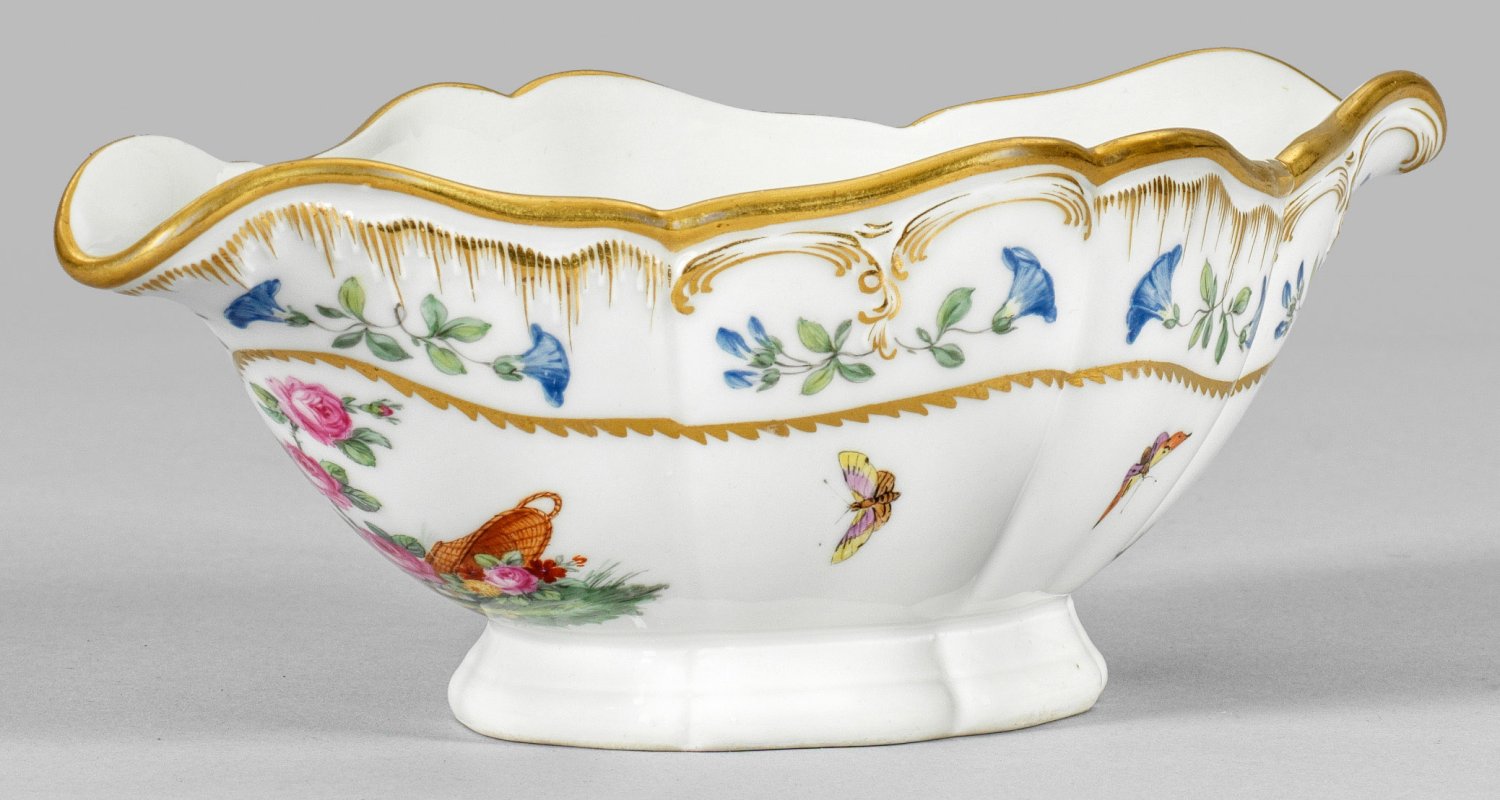 Passig geschweifte Navetteform mit Doppelausguss. Reliefdekor "Neuglatt". Zu den Schmalseiten die Darstellung eines blühenden Rosenstocks mit umgestürztem Blumenkörbchen auf Wiesenterrain. Die Längsseiten mit Schmetterlingsdekor sowie Blumenbordüre. Polychrome Malerei mit Goldstaffage und Gold-Zahnkante. Dekormalerzeichen für Paul Rogge (seit 1887 tätig). Zepter-, Malerei- und bekrönte Besitzermarke "WR" mit Dat. 1891 in Purpur. H. 7,5 cm. L. 23,5 cm.