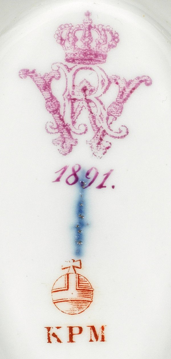 Das Tafelservice wurde 1772 ursprünglich für Friedrich den Großen für das Schloß Charlottenburg gefertigt. Im Laufe des 19. Jhs. wurden Geschirrstücke des sog. "Charlottenburger Service" ergänzt (Vgl. Stadtmuseum Berlin, Inv.-Nr. VI 20473), zum Teil mit ligierter Besitzermarke von König Friedrich Wilhelm IV.