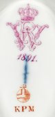 A porcelain sauce boat painted with decor "Charlottenburg Service" from the property of William II., German Emperor and King of Prussia. Sceptre, painter's and growned owners mark, dated 1891.