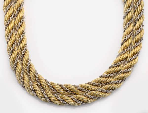 Gelb- und Weißgold, gest. 750. Herstellerzeichen. Gew. ca. 140,39 g. Sehr feine Goldschmiedeausführung.
