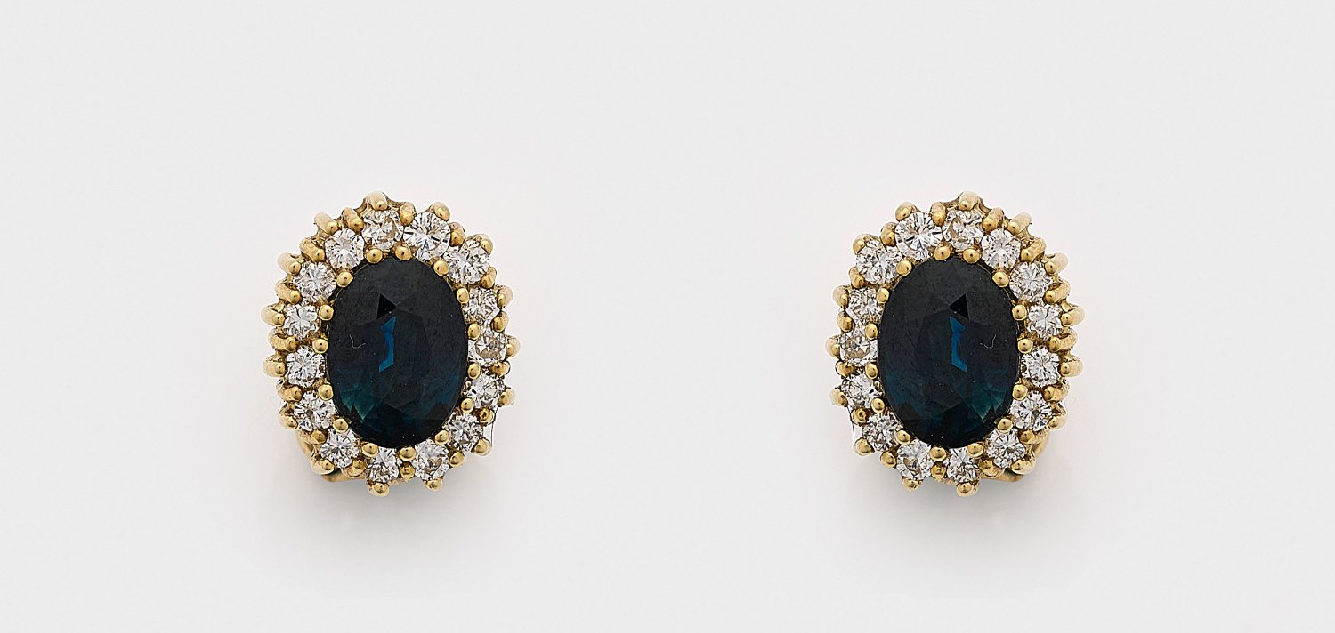 Pair of earrings set with sapphires approx. 2,00 ct. and brilliants approx. 0,60 ct., in 14 k gold.