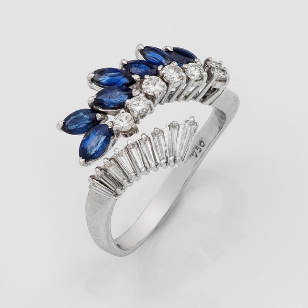 Weißgold, gest. 750. Schauseitig besetzt mit nahezu kornblumenblauen Saphir-Navetten von zus. ca. 1,40 ct., Brillanten von zus. ca. 0,30 ct. (G-H/vs) sowie Diamant-Baguetten von zus. ca. 0,40 ct. (G-H/vs); Gew. ca. 6,09 g.