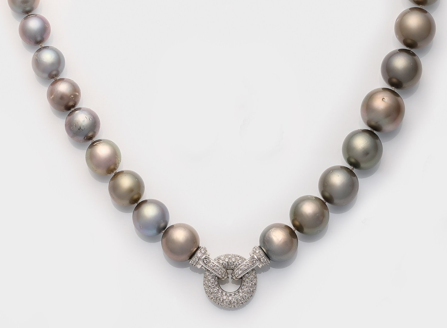 Weißgold, gest. 750. Einreihige Kette aus insges. 35 anthrazitfarbenen sowie grau-braunen Tahiti-Zuchtperlen von ca. 13 mm - 15 mm in sehr farbintensivem violett-grünem Lüster. Ringschließe mit Diamant-Pavé.