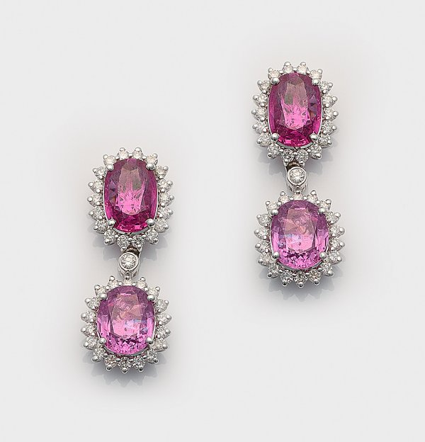 Pair of earrings set with pink sapphires approx. 5,09 ct. and brilliants approx. 0,80 ct., in 18 k white gold. Certificate included.