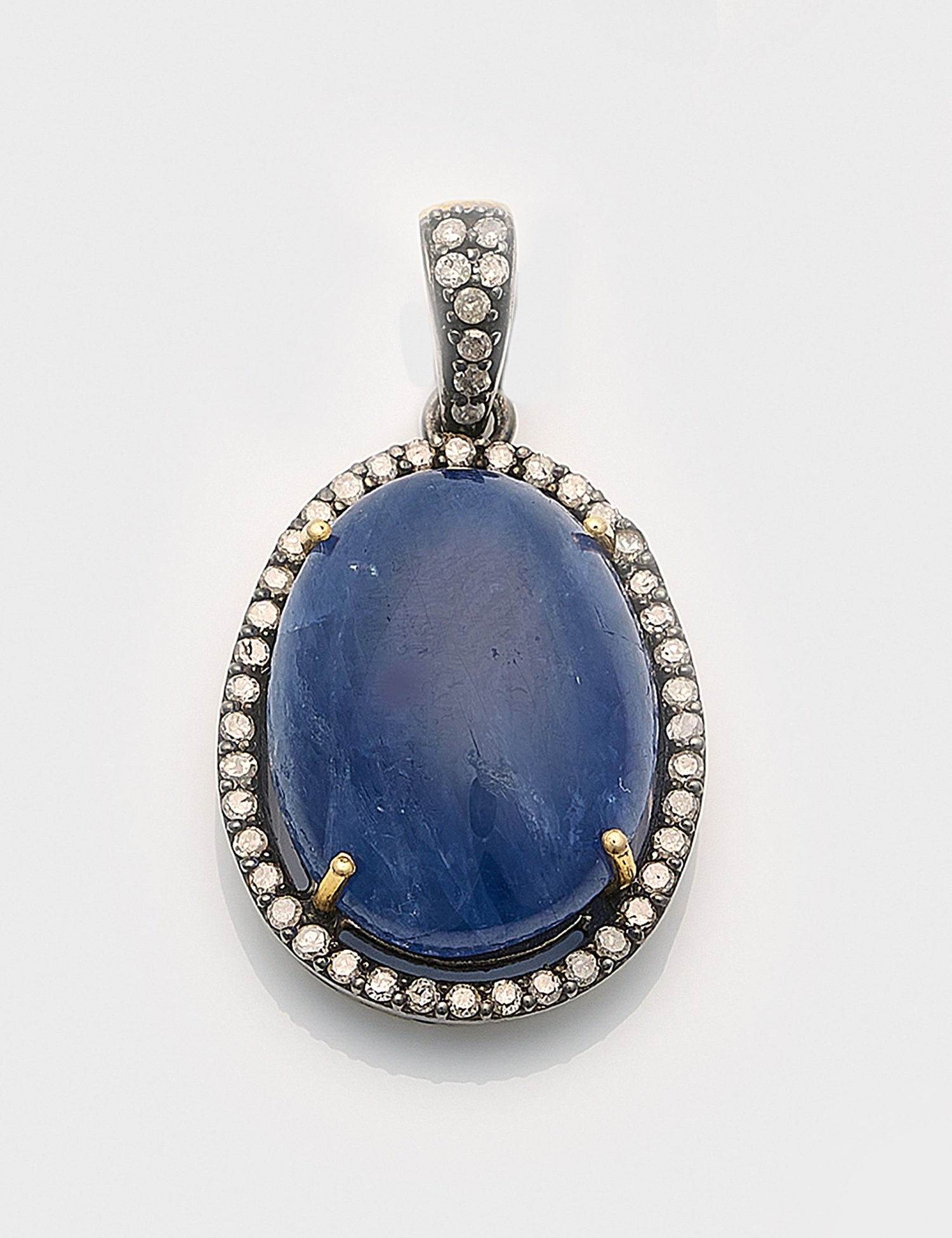 Pendant set with a cornflower blue sapphire approx. 17,70 ct. and diamonds approx. 0,50 ct., in 14 k gold and silver.