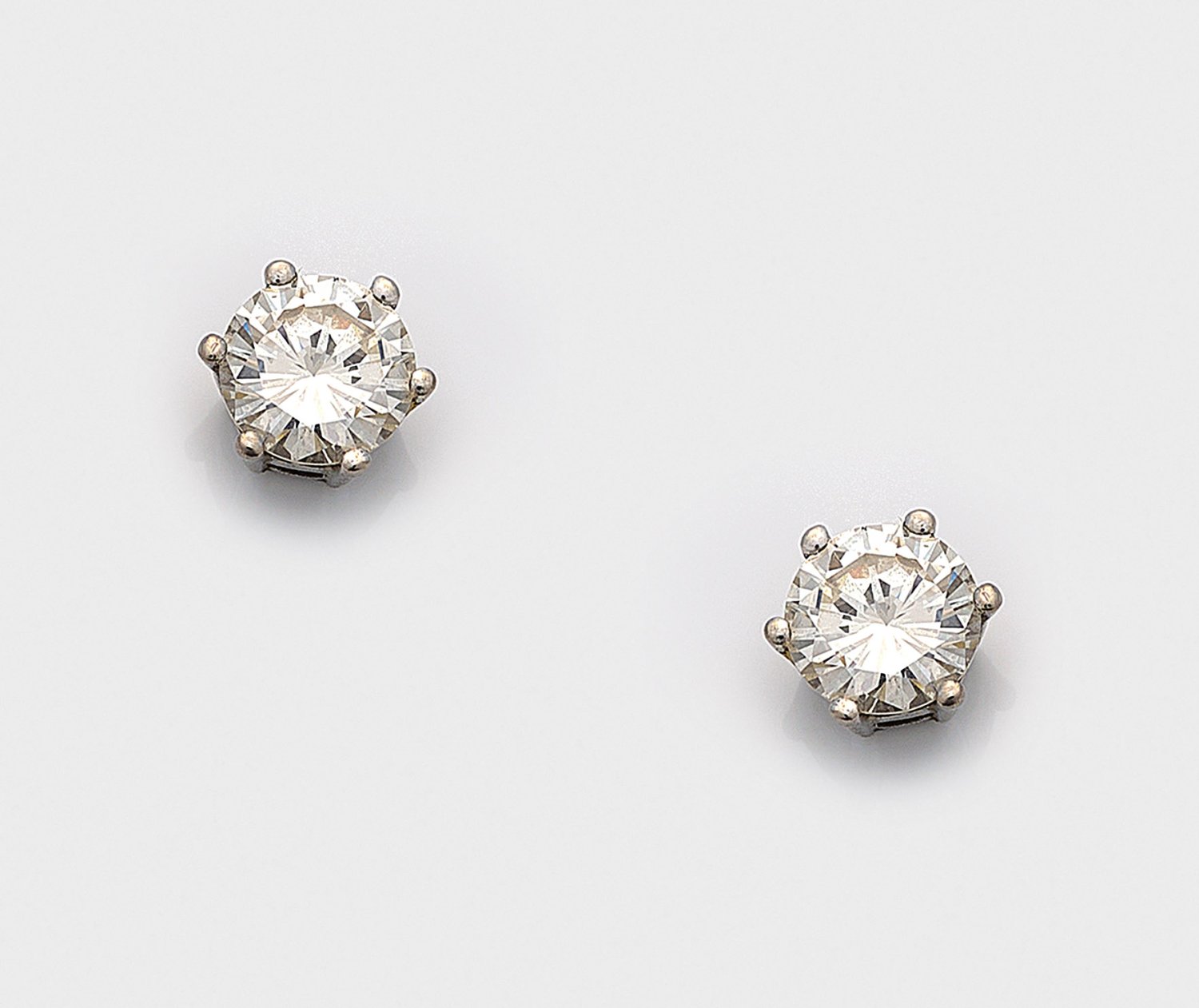 Pair of earrings by WEMPE set with 2 brilliant solitaires approx. 1,00 ct. (H/si), in 14 k white gold. Certificate included.