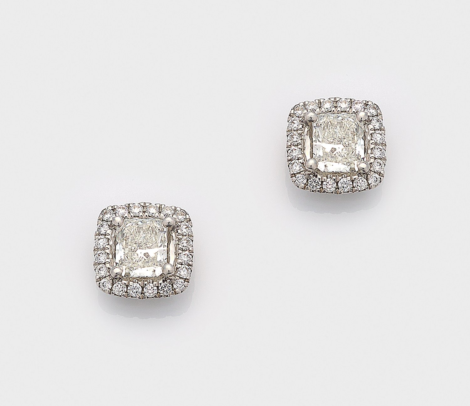 Weißgold, gest. 750. Zentral besetzt mit 2 Diamanten von zus. ca. 0,80 ct. (E/if) im Radiantschliff, entouriert von kleinen Diamanten von zus. ca. 0,32 ct.; Ges.-Gew. ca. 2,54 g.