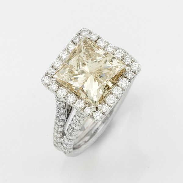 Weißgold, gest. 750. Zentral besetzt mit einem Diamanten von ca. 4,80 ct. (TC/p) im Princesscut, flankiert von Brillanten von zus. ca. 1,20 ct. (F-G/vs). Gew. ca. 7,82 g.