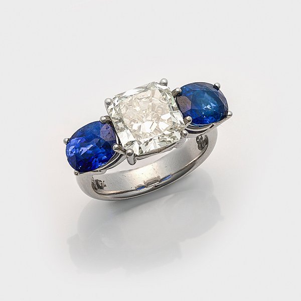 Weißgold, gest. 750. Zentral besetzt mit einem Diamanten von ca. 5,10 ct. (M/vvs) im Radiantschliff, flankiert von 2 unbehandelten kornblumenblauen Saphiren von zus. ca. 4,78 ct.; Gew. ca. 8,81 g.