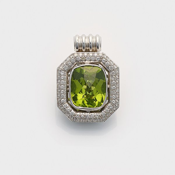 Pendant set with a peridot approx. 5,00 ct. and numerous diamonds, in 18 k white gold.