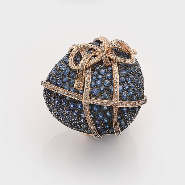 Roségold, teilw. mit Silber verbödet, gest. 14 ct./800. Besetzt mit kornblumenblauen Saphiren und Diamanten in Pavéfassung. Gew. ca. 27,21 g.