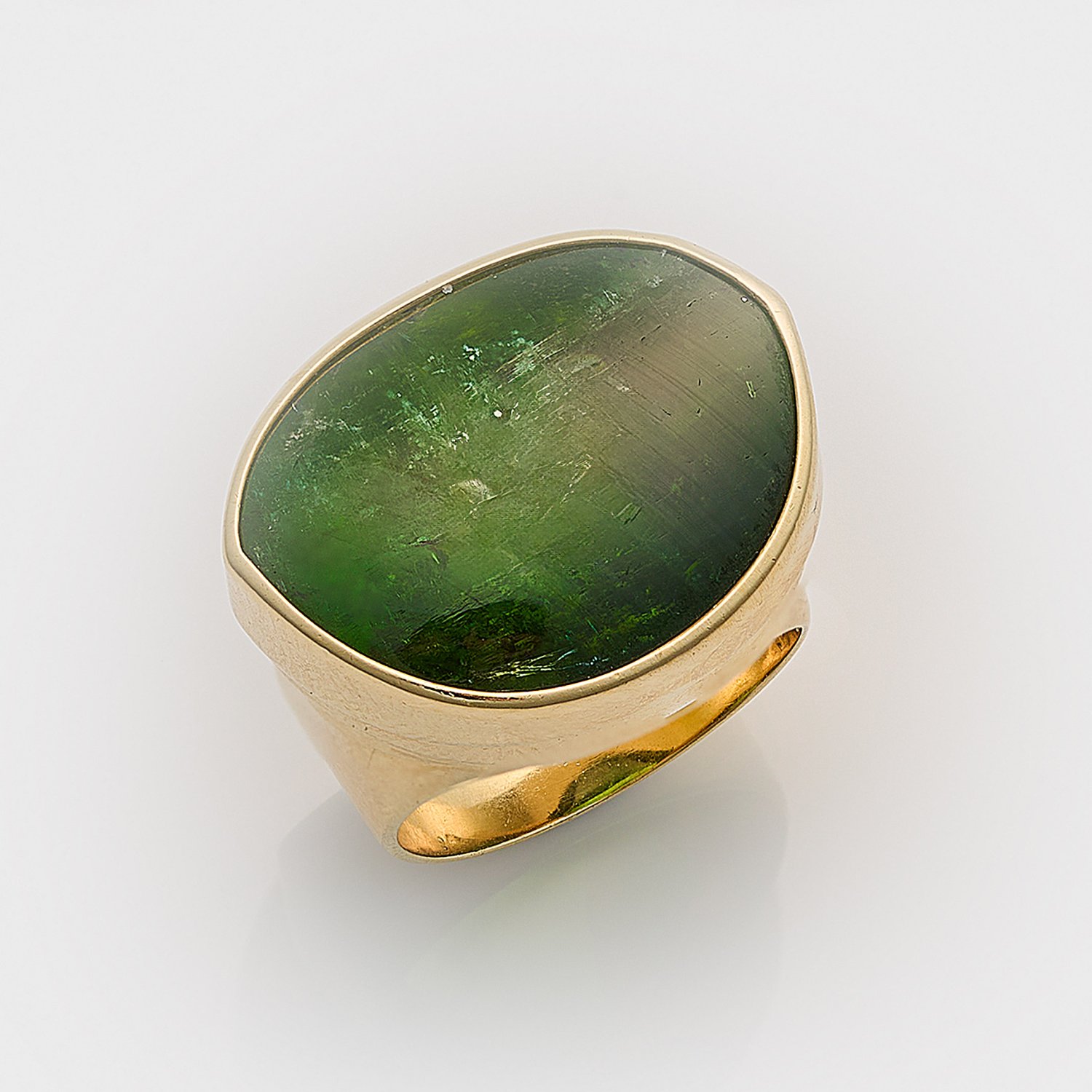 Gelbgold, gest. 750. Zentral besetzt mit Vivid Yellow Green-Turmalin von ca. 43 ct. im Cabochonschliff. Gew. ca. 19,38 g. Sehr schöne Goldschmiedeausführung.