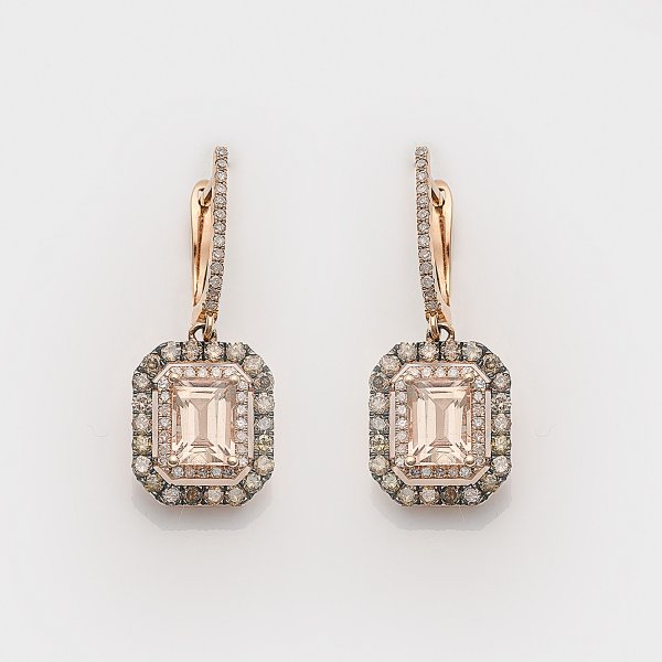 Pair of earrings set with morganites approx. 2,20 ct. and diamonds approx. 1,12 ct., in 18 k red gold.