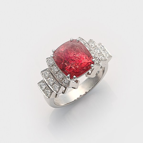Weißgold, gest. 750. Zentral besetzt mit unbehandeltem Orange-Pink Spinell von ca. 7,12 ct. im Cushionschliff, flankiert von Brillanten von zus. ca. 0,67 ct.; Gew. ca. 9,71 g.