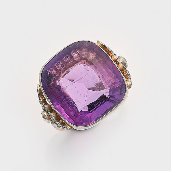 Roségold, 14 ct.; Zentral besetzt mit einem fliederfarbenen Amethyst von ca. 17,1 mm x 15,1 mm, flankiert von kleinen Altschliffdiamanten von zus. ca. 0,30 ct.; Gew. ca. 7,50 g.