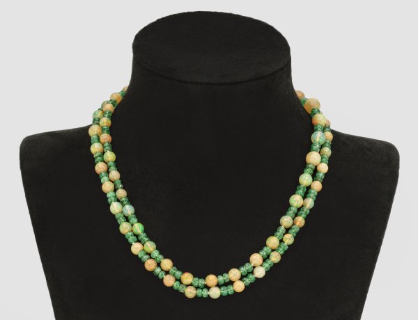 Einreihige Kette im Verlauf aus 64 Opalperlen von ca. 6 mm in sehr schönem Farbspiel, unterteilt durch facettierte Smaragd Perlen von zus. ca. 15 ct., vergoldete Schließe.