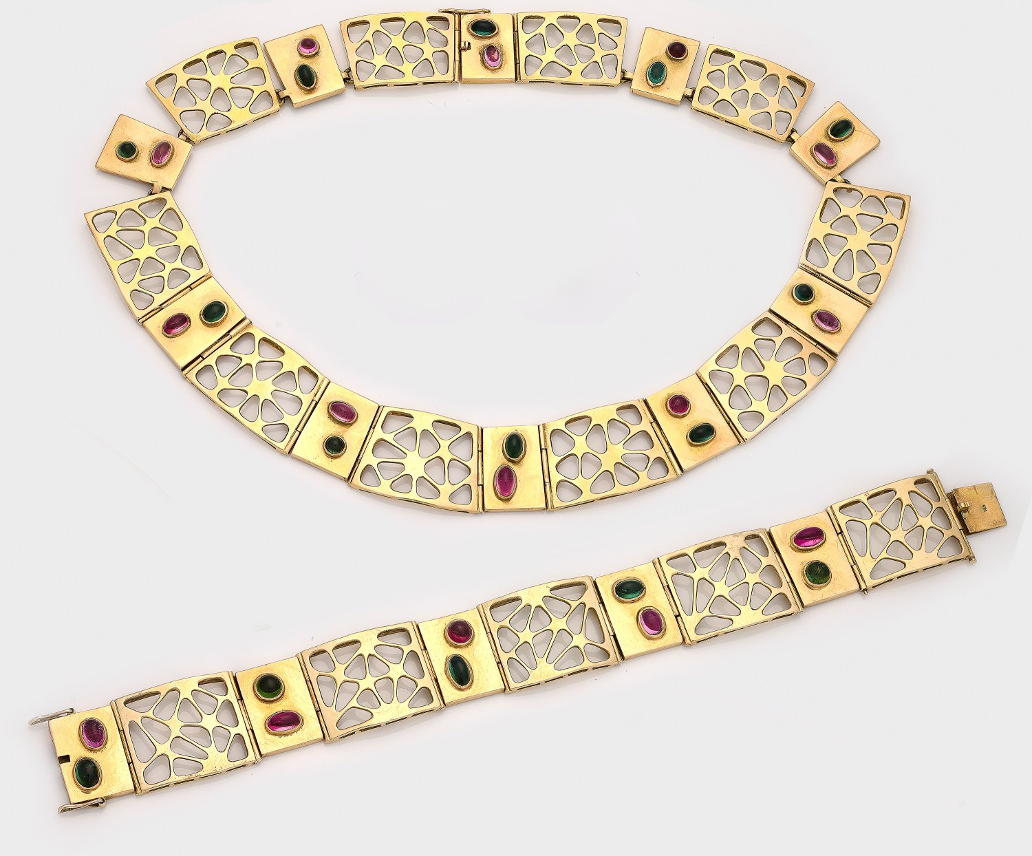 Collier und korrespondierendes Armband. Gelbgold, gest. 585. Breite Bandform aus rechteckigen Gliedern, teils gitterartig durchbrochen, akzentuiert durch grüne und rosafarbene Turmalincabochons. Ges.-Gew. ca. 105,12 g. Sehr feine Goldschmiedeausführung in Ajour.