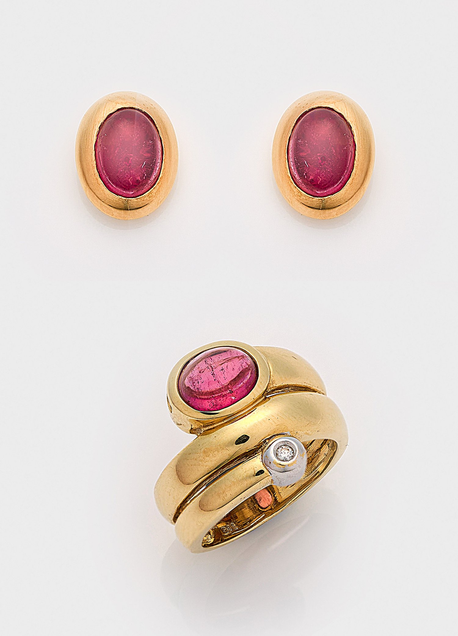 Stilisierter Schlangenring und Paar korrespondierende Ohrringe. Gelbgold, gest. 585. Besetzt mit rosafarbenen Turmalinen im Cabochonschliff und einem Brillanten von ca. 0,05 ct.; Ges.-Gew. ca. 14,80 g.
