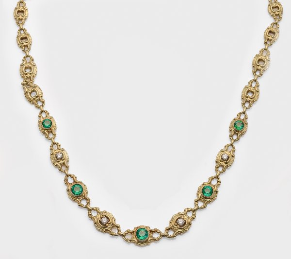 Gelbgold, gest. 585. Collier-Kette aus vierpassigen Rocaill-Kartuschen besetzt mit Turmalinen von zus. ca. 2,00 ct. und Brillanten von zus. ca. 0,40 ct.; Gew. ca. 19,28 g. Sehr feine Goldschmiedeausführung.