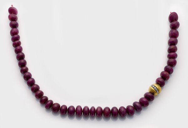Gelb- und Weißgold, gest. 750. Einreihige Kette aus insges. 42 brombeerfarbenen Rubinen in Boutonform. Korrespondierende, schauseitig mattelierte Schließe, besetzt mit Brillanten von zus. ca. 0,20 ct.; Gew. ca. 134,42 g.