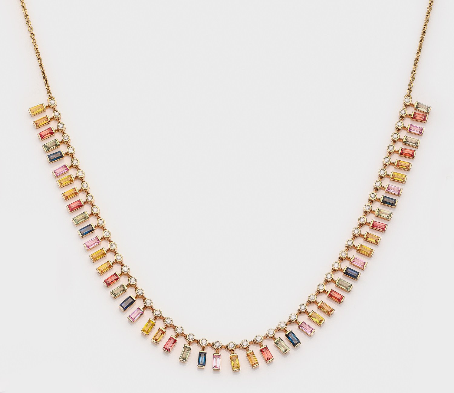 Necklace set with rainbow colored sapphires approx. 17,50 ct. and diamonds approx. 0,80 ct. (G-H/si), in 18 k red gold.