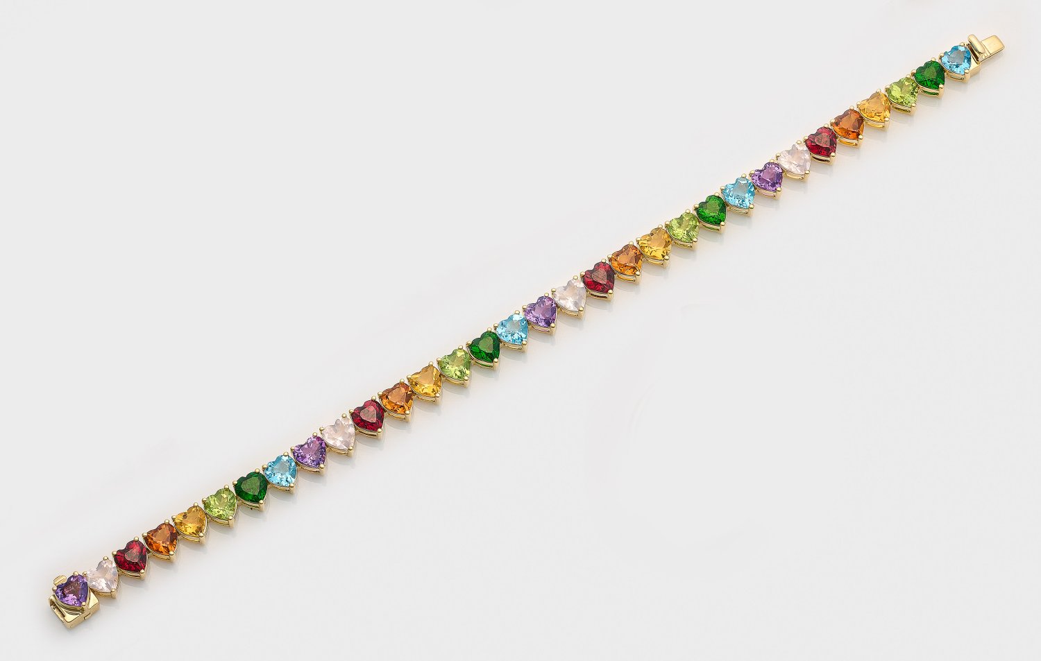 Gelbgold, gest. 585. Schauseitig besetzt mit Amethysten, Citrinen, Peridots, Topasen und Turmalinen im Herzschliff. Gew. ca. 12,87 g.