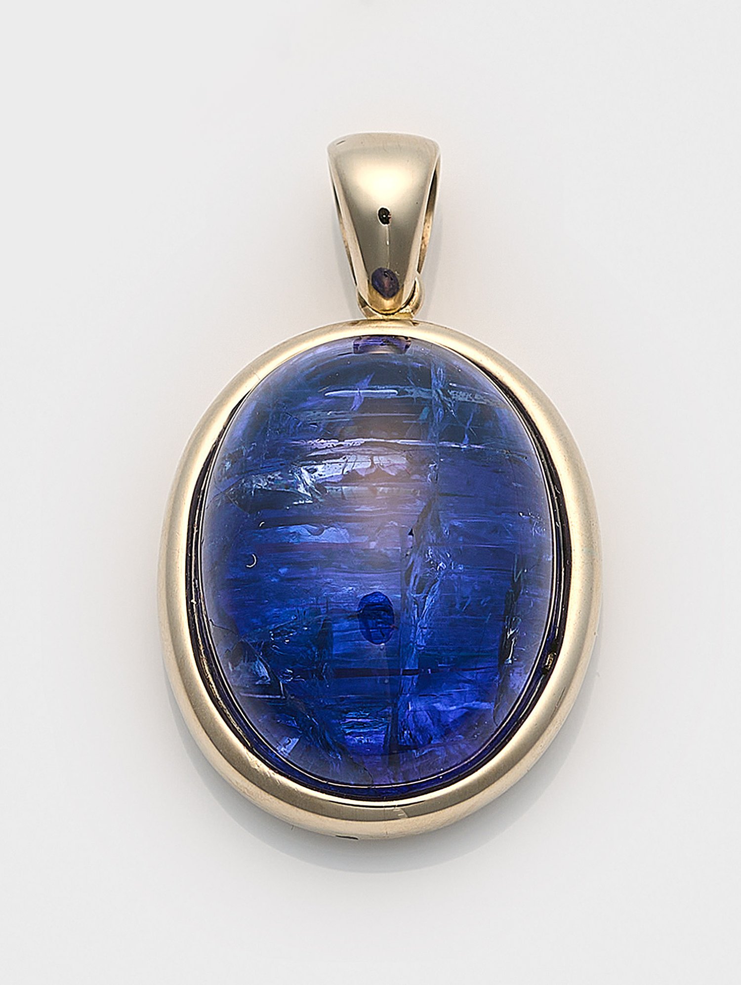 Weißgold, gest. 585. Zentral besetzt mit blauviolettem Tansanit von ca. 30 ct. im Cabochonschliff. Gew. ca. 13,10 g.