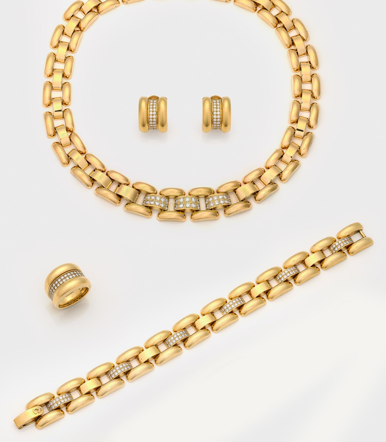 Collier, korrespondierendes Armband, Ring und Paar Ohrclips. Gelbgold, gest. 750. Besetzt mit Brillanten von zus. ca. 5,38 ct. (F-G/if). Herstellerzeichen. Ref.-Nr. 9139988, 2130350, 9304348, 82/6435-41, 9139988, 6435, 9148467, 81/2635-41, 9286. 2130350, 85/2672-41. Ges.-Gew. ca. 264,86 g. Original blaue, goldgeprägte Lederbox und Zertifikate.