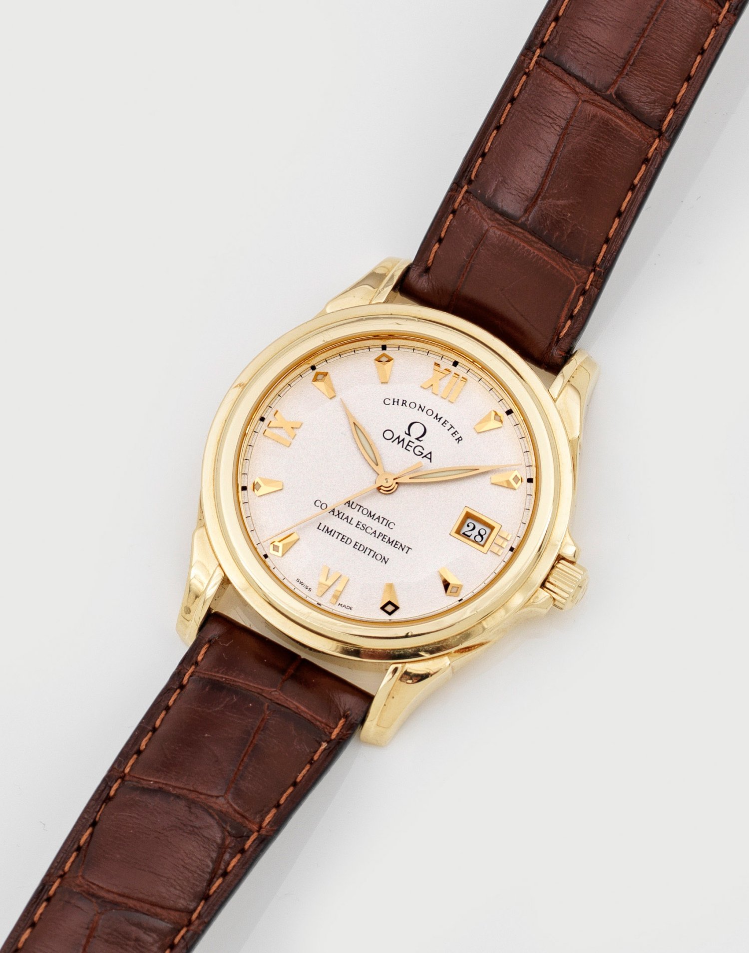 Gelbgold, gest. 750. Rundes profiliertes Uhrengehäuse, Silber gekörntes Zifferblatt, Indexe mit Tritiumauflage sowie Lanzenzeiger, Datumsanzeige. Braunes Krokodil-Lederarmband mit Gold-Spangenschließe. Neuer Automatik-Chronometer, Uhrwerk mit Co-Axial Hemmung der nachfolgenden Generation. Auflage 299/999. Herstellerzeichen. Ref.-Nr. 059113122, Serien-Nr. 60328478, Service-Karte und Omega-Schreiben zur Werkoptimierung.