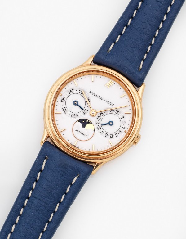 Gentleman's wristwatch by Audemars Piguet, automatic moon phase, in 18 k gold. Manufacturer's mark. Origianl leather bag and paper.