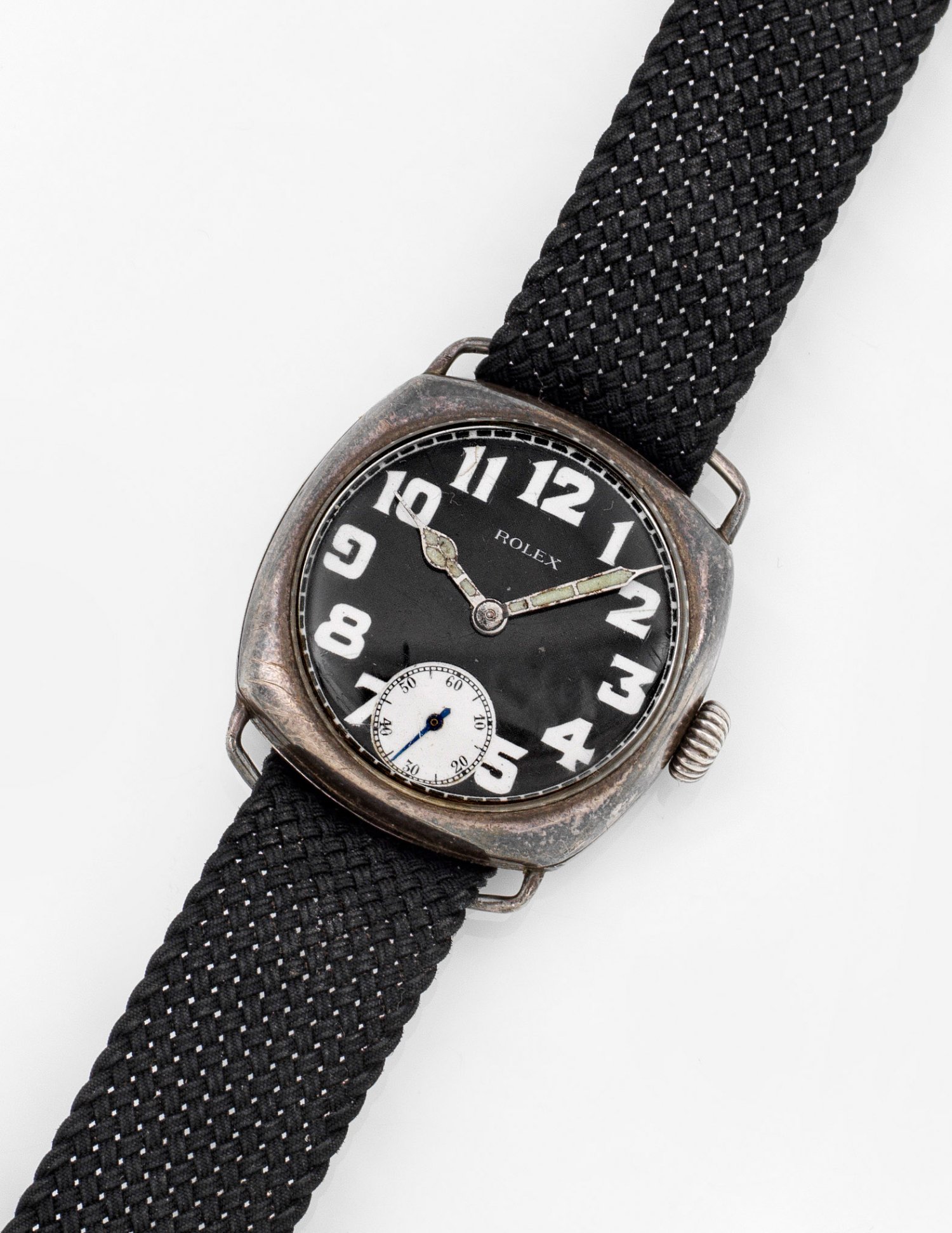 Silber. Cushionförmiges Uhrengehäuse, schwarzes Zifferblatt mit weißen arabischen Zahlen, Zeigern mit Tritiumauflage, kleiner Sekunde. Schwarzes geflochtenes Armband mit Dornenschließe. Mechanisches 15 Jewel Werk mit Kronenaufzug. Herstellerzeichen. Ref.-Nr. 35760.