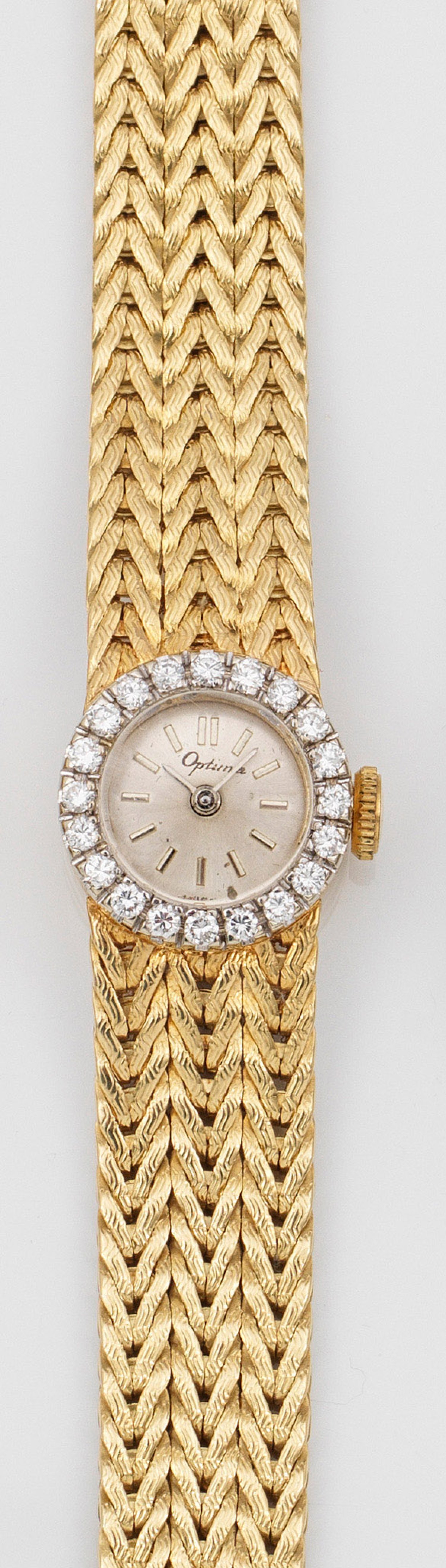 Lady's wristwatch by Optima, set with brilliants, mechanical movement, in 18 k gold.