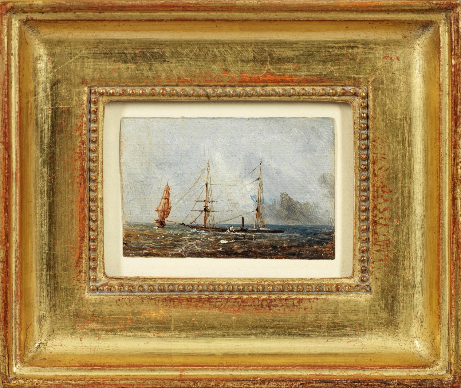Fein gemaltes, atmosphärisch gestimmtes Marine-Miniaturgemälde Hulks, der an der Amsterdamer Akademie studierte und 1834-1870 in den Niederlanden ansässig war. Er malte mit Vorliebe Küsten- und Hafenmotive mit Schiffen vor niedrigem Horizont. Öl/Papier. Verso sign.; 5,8 cm x 4,8 cm. Rest.; Rahmen.