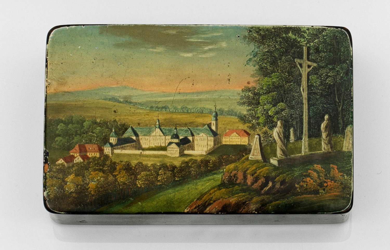 Pappmaché, schwarz lackiert. Rechteckiger Korpus mit scharniertem, gering zur Mitte aufgewölbtem Deckel. Darauf die Darstellung einer weitläufigen, hügeligen und bewaldeten Landschaft mit Klosteranlage. Auf der rechten Seite im Vordergrund die rückseitige Darstellung eines Flurkreuzes. Minim. best.; H. 2,5 cm. 9,5 cm x 5,7 cm.