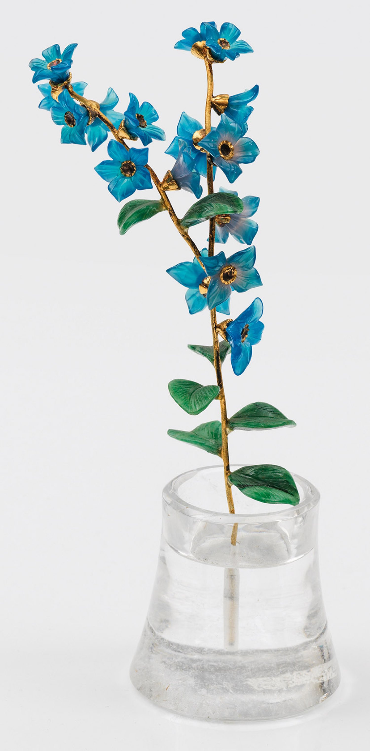in der Art von Karl Fabergé. Silber, teilw. vergoldet sowie Bergkristall und Nephrit. Stand in Form einer konischen Vase. Herausnehmbarer Vergissmeinnicht-Zweig mit kleinen hellblauen Glasblüten sowie Blättern. H. 18,5 cm.