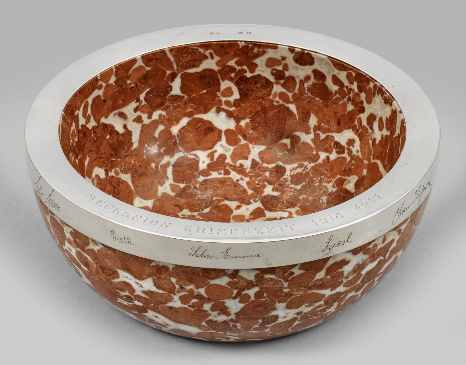 Marmor mit Silbermontierung. Glatte, dickwandige Schale aus rötlich-braunem und weißem Marmor. Der Schalenrand umzogen von eleganter, breiter Silberkante, umlaufend gravierte Unterschriften von ebenso bez. Schwestern u. a. "Schw. Stefanie", "Schw. Emma", "Schw. Marie", "Schw. Lina", "Schw. Helene". Auf Randoberkante gravierte Inschrift "Secession Kriegszeit 1914-1917". Gest., Beschauzeichen, Herstellerzeichen. H. 10 cm. D. 24,3 cm.