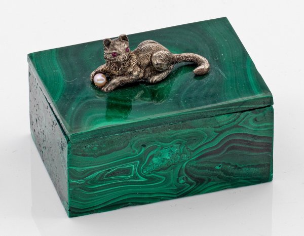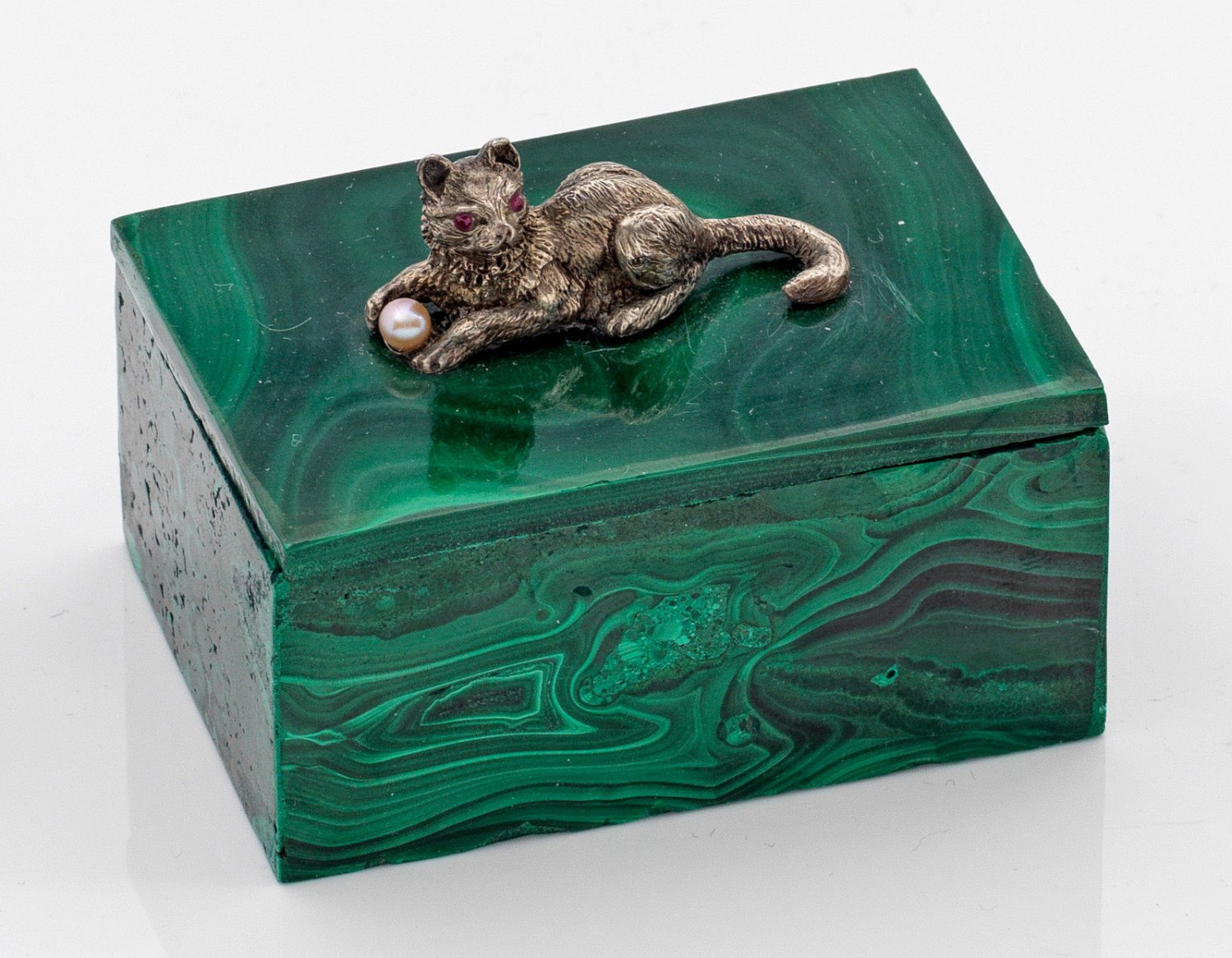im Stil von Karl Fabergé. Malachit und Silber. Rechteckig mit gerader Wandung. Auf flachem Deckel vollplastische, applizierte Figur einer liegenden Katze mit einer Perle spielend. Als Augen zwei kleine Granatcabochons. Gest.; H. 4,4 cm. 6 cm x 3,9 cm.