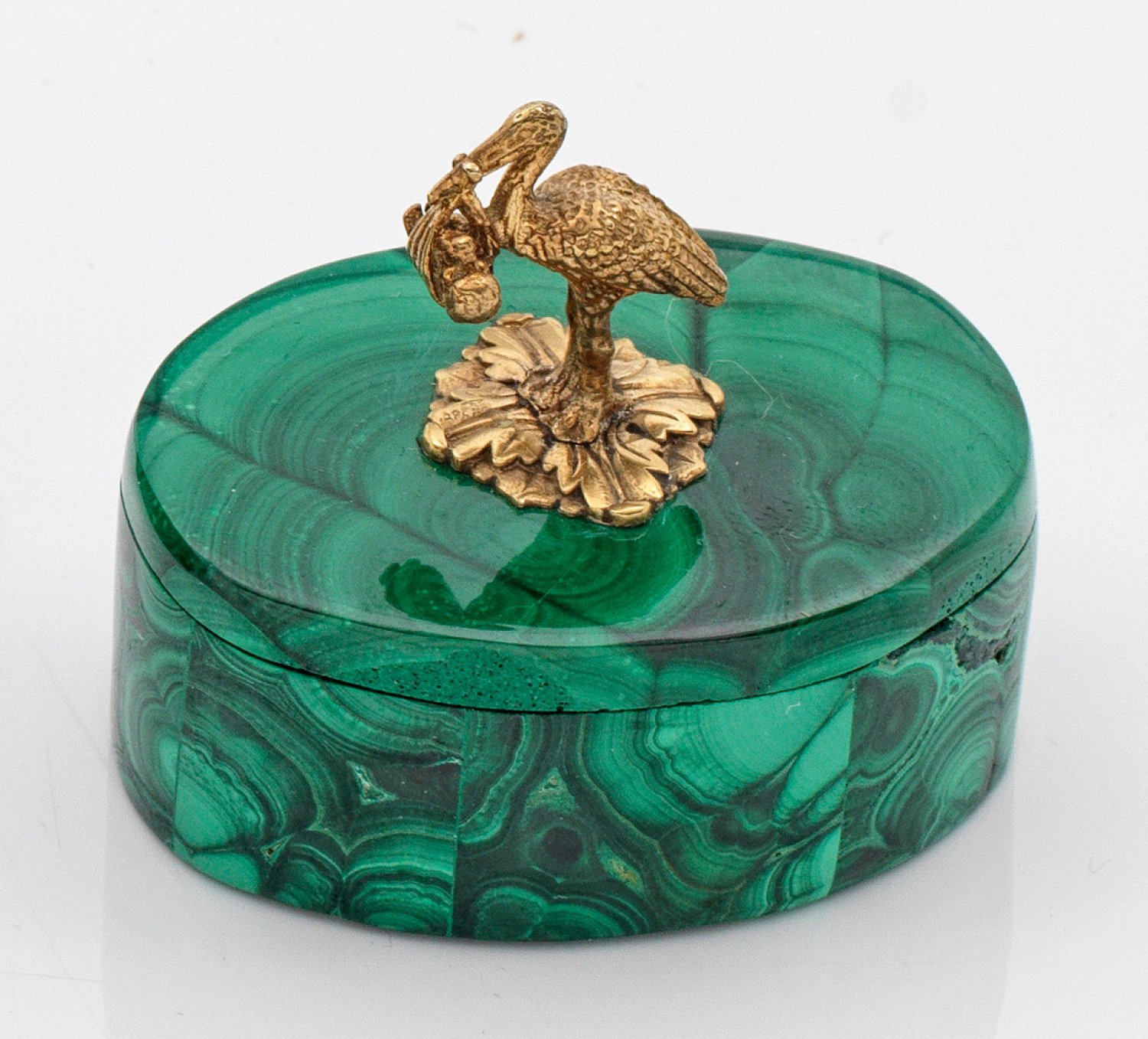 im Stil von Karl Fabergé. Silber, vergoldet. Ovaler Korpus mit gerader Wandung. Auf flachem Deckel eine reliefierte Blattrosette mit vollplastischer Darstellung eines Storches, ein Kind im Schnabel tragend. Gest. 88. H. 4 cm. 4,8 cm x 3,2 cm.